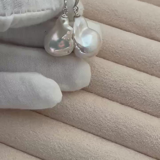 Elegant freshwater baroque pearl earrings suspended from classic silver-tone fish hook wires. Each pearl has a natural, organic shape that makes every pair unique. The simple drop design highlights the soft luster of the pearls while keeping the look timeless and easy to wear.