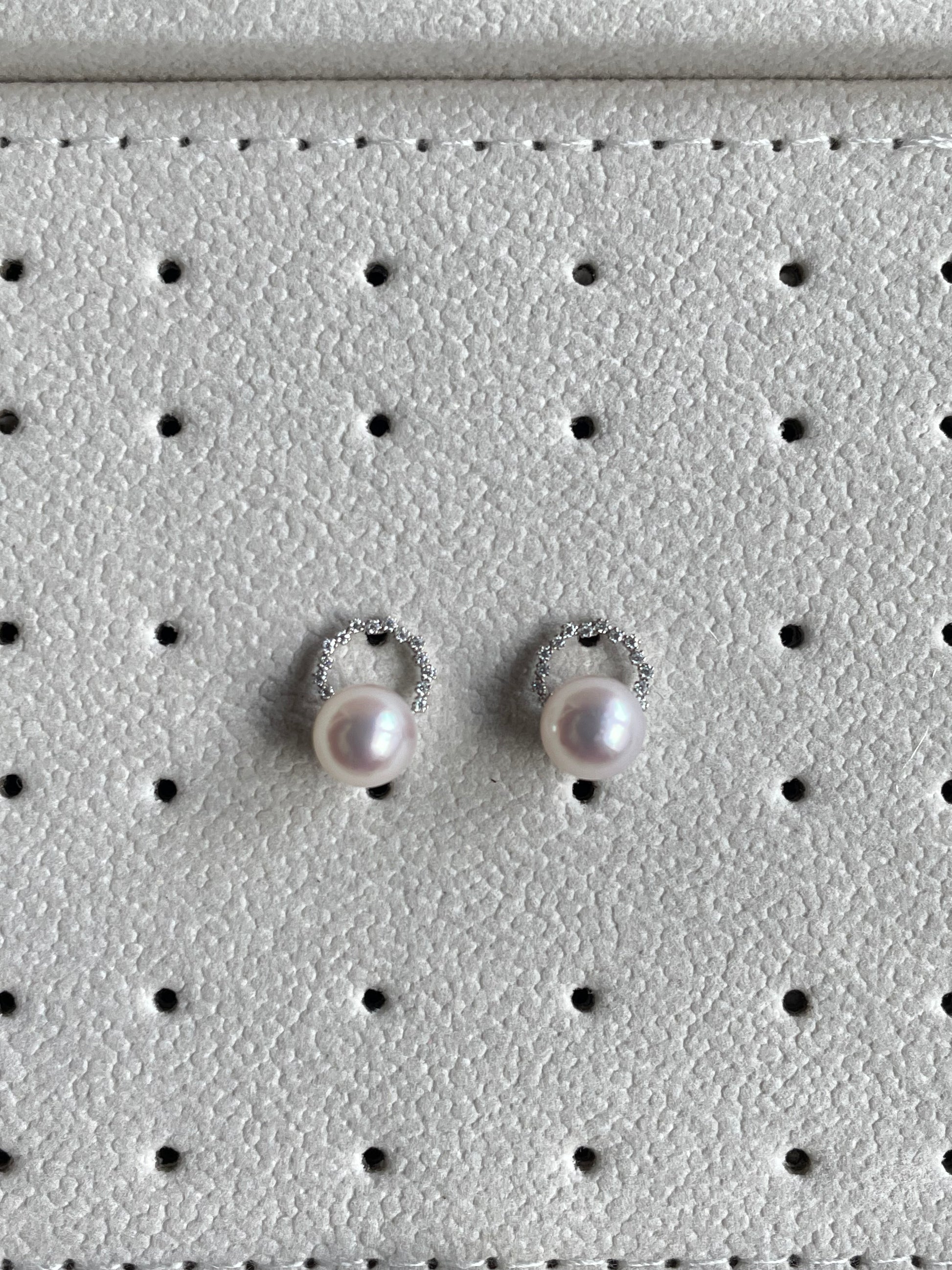 Flawless round Akoya pearls with a soft pink overtone radiate from a fine halo of natural diamonds, set in white gold. The balanced arc design captures light with quiet brilliance — modern, minimal, and effortlessly refined.