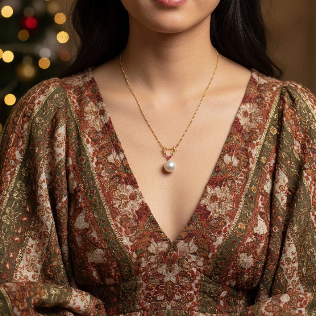 A luminous pearl rests beneath delicate golden antlers, touched with a hint of pink sparkle. Inspired by nature’s quiet beauty, this necklace captures grace and warmth — perfect for gifting or adding a gentle glow to your holiday season. No edits, no filters — just truth and light.
